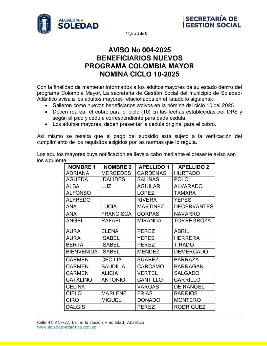 AVISO No 004-2025 BENEFICIARIOS NUEVOS PROGRAMA COLOMBIA MAYOR NOMINA CICLO 10-2025 Con la finalidad de mantener informados a los adultos mayores de su estado dentro del programa Colombia Mayor, La secretaria de Gestión Social del municipio de Soledad-Atlántico avisa a los adultos mayores relacionados en el listado lo siguiente: Salieron como nuevos beneficiarios activos en […]